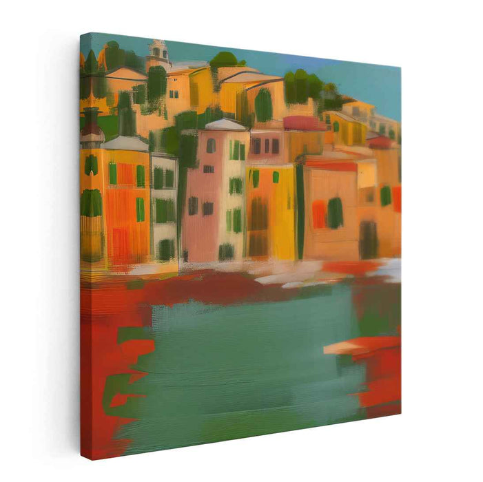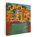Introducing "Mediterranean Harmony," a vibrant coastal town canvas art print that transports viewers to a picturesque seaside village reminiscent of the charming towns along the Mediterranean coast. This captivating artwork captures a row of multi-colored buildings gracefully descending a gentle hillside, exuding a lively and colorful charm.