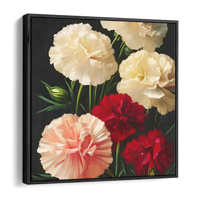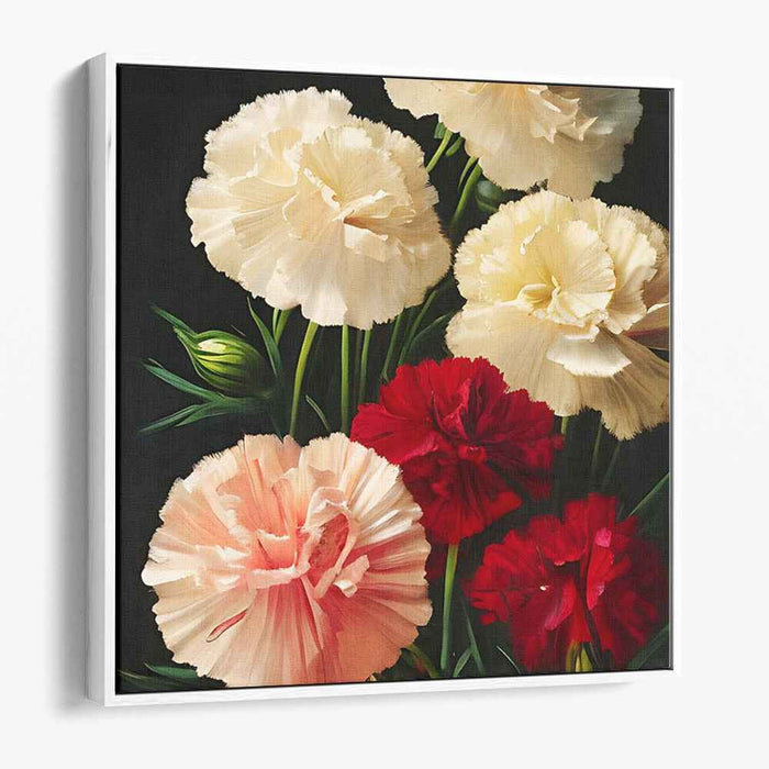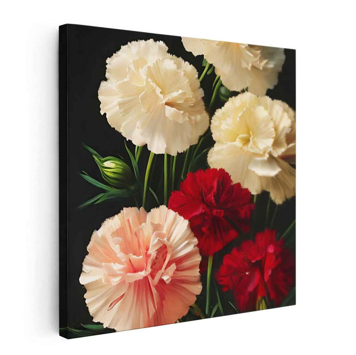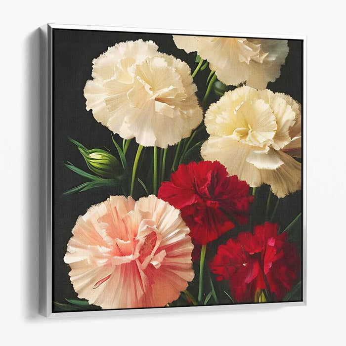 Introducing 'Melodic Petal Ensemble: A Vivid Symphony of Carnations,' a mesmerizing floral canvas art that encapsulates the delicate beauty and vibrant essence of a bouquet of carnations. This exquisite painting portrays a breathtaking array of fully bloomed carnations set against a deep, dark backdrop, intensifying the vividness of the flowers.