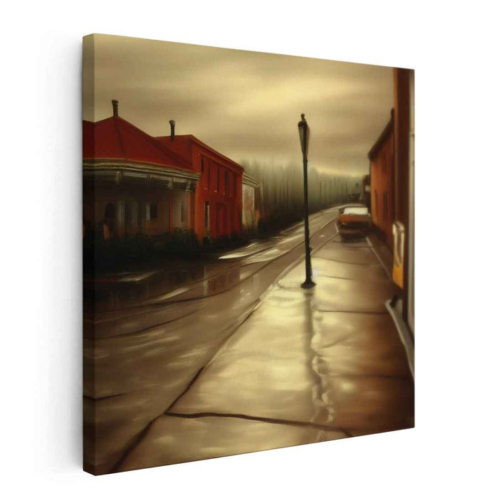 Introducing 'Metropolis Melodies: A Serene Urban Landscape,' a mesmerizing piece that transports you to a tranquil early morning setting on a rain-soaked street. The artwork's warm, earthy brown tones infuse a sense of peace and serenity, complemented by subtle hues of orange and grey, evoking a nostalgic and calming ambiance.