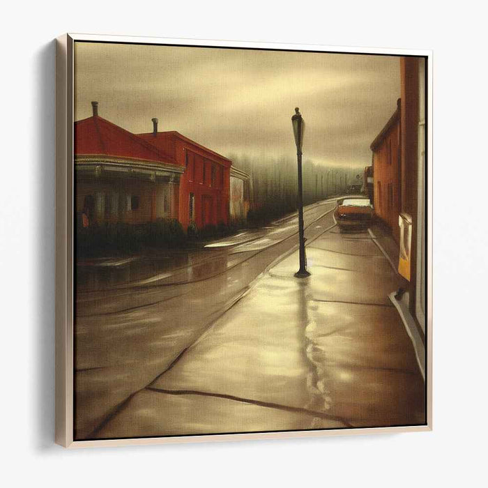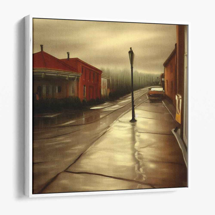 The artist skillfully employs a soft-focus technique, using gentle brushstrokes to seamlessly blend colors, creating a dreamy and ethereal quality. The reflections on the wet pavement are masterfully depicted through a play of light and shadow, enhancing the painting's realistic yet poetic essence.