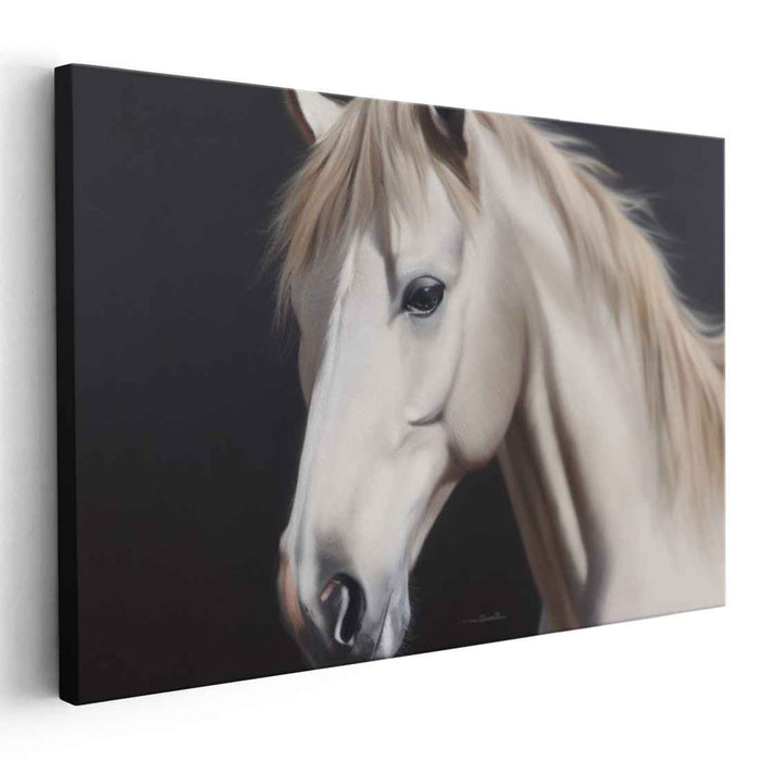 Introducing "Midnight Equine Spirit," a captivating portrait of a white horse exuding elegance and grace against a striking black backdrop. This exquisite artwork meticulously captures the intricate details of the horse's features, from the smoothness of its coat to the intelligence shining in its eye, all portrayed with a remarkable degree of realism.
