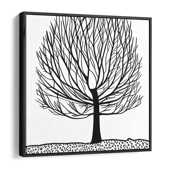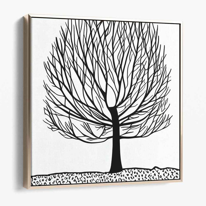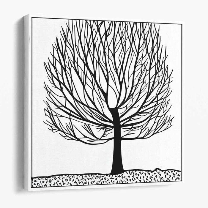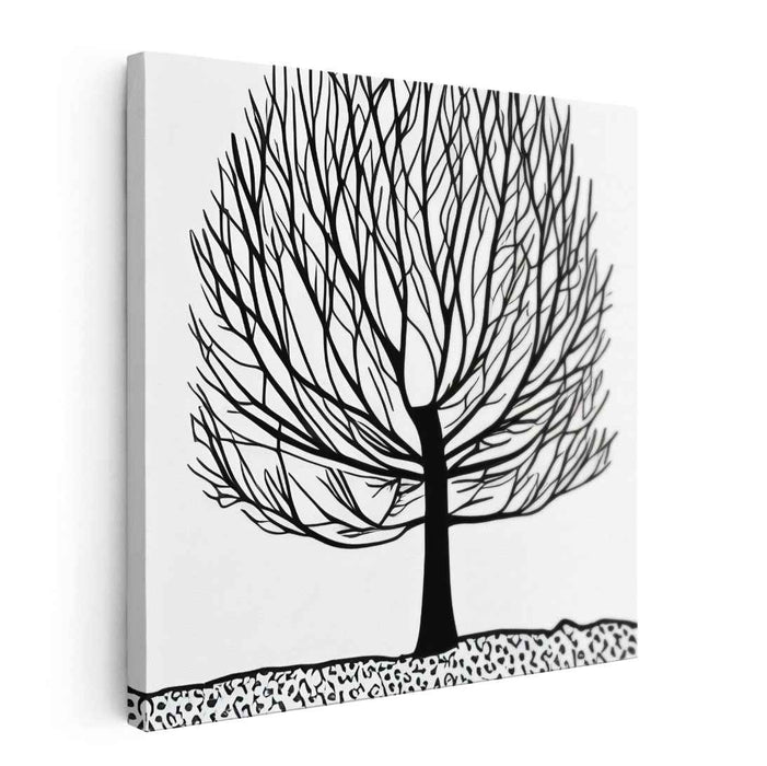 The robust, dark trunk anchors a delicate web of branches that gracefully extend like intricate lacework. The textured surface at the tree's base, resembling scattered pebbles, adds a subtle complexity to the composition. The artist's choice of a minimalist black and white palette enhances the artwork's timeless quality and understated elegance.