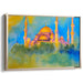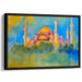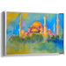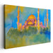 Introducing 'Mirrored Reflections,' a mesmerizing canvas art print that transports viewers to a divine realm, where a magnificent mosque, reminiscent of the iconic Hagia Sophia, emerges from a mystical haze of colors. The central dome, resplendent in gold, dominates the scene, flanked by ethereal minarets reaching towards the heavens, bathed in a warm glow against the cool blue sky.