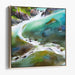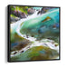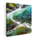 The artwork boasts a rich palette dominated by lush greens and soothing blues, masterfully depicting the clarity and movement of the flowing water. The earthy tones of brown and grey used to render the rocks provide a striking contrast to the softness of the water, enhancing the natural allure of the landscape. The colors blend seamlessly, creating a misty ambiance that extends beyond the confines of the canvas.