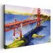 The focal point of the artwork is the Golden Gate Bridge, painted in a striking red-orange hue that cuts diagonally across the canvas from the bottom left to the top right. The bridge stands out against the backdrop of the deep blue waters of the bay, which sharply contrast with the lush green hills and islands surrounding it. Above, the sky transitions in a soft gradient of light blue and white, evoking a sense of a clear, sunny day.