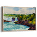 Inspired by the impressionistic art movement, this painting features loose brushstrokes that capture the essence of light and mood rather than intricate details. The foreground boasts rocky outcrops in deep burgundy and rust tones, offering a striking contrast to the vibrant greens of the foliage and the calming blues of the water. In the background, modern buildings peek through the mist, creating a captivating juxtaposition of nature and urban life.