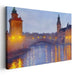 Introducing 'Misty Evening Glow: Historical Cityscape by the River,' a mesmerizing canvas art print that transports you to a tranquil riverside city at dusk, bathed in a soft, ethereal glow. This captivating artwork features an elegantly arched bridge spanning gracefully over a serene river, with the gentle radiance of street lamps casting shimmering reflections on the water's surface.