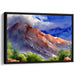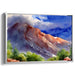The color scheme is a rich interplay of blues and greens, creating a dramatic contrast against the mountain's warm tones. The sky above transitions from a brilliant blue to deeper shades near the horizon, adorned with wispy clouds that add depth and movement to the scene. Below the mountain, lush greenery thrives, depicted in lively shades of green that infuse the piece with freshness and vibrancy.