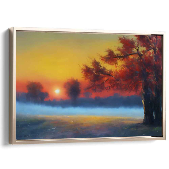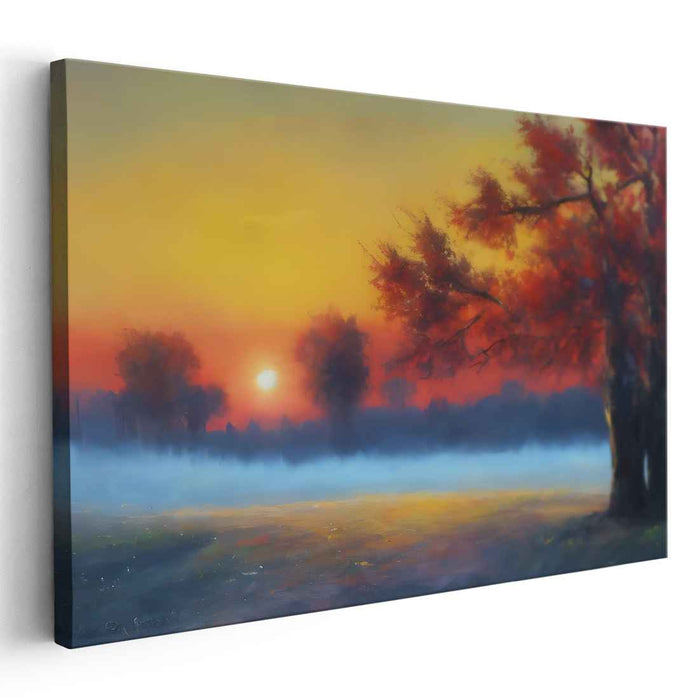 Enhance your decor with a museum-quality canvas print of "Misty Horizons Glow," capturing the essence of a tranquil autumn landscape. Immerse yourself in the beauty of this peaceful artwork, adding a touch of warmth and reflection to your living space every day.