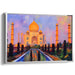 Introducing 'Misty Palace Impression,' a mesmerizing canvas art print that captures the iconic Taj Mahal in a breathtaking sunset setting. This impressionistic masterpiece is a harmonious blend of warm and cool tones, with the majestic structure glowing in a soft, golden light against a sky painted in hues of pink, orange, and purple, evoking a sense of serene yet dynamic beauty.