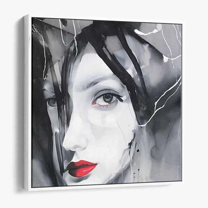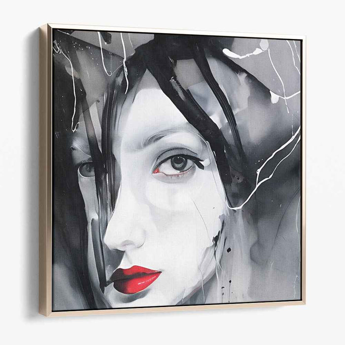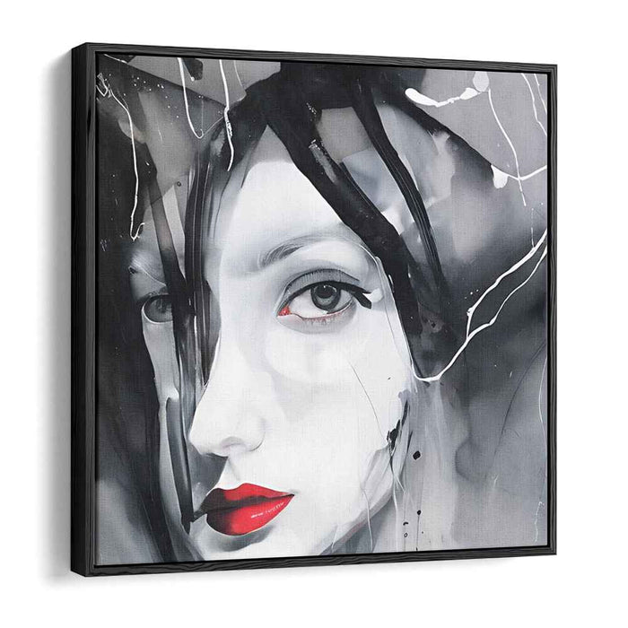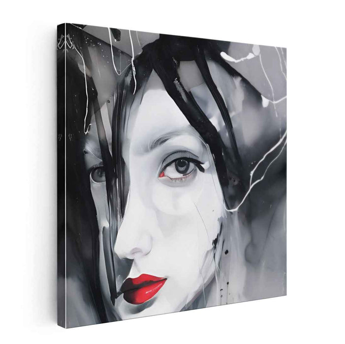 Introducing 'Monochrome Mystery: Modern Portrait with Red Accents,' a captivating canvas art piece that delves into the depths of emotion through a striking grayscale portrait of a woman with bold red highlights. This artwork mesmerizes viewers with its intense focus on the woman's gaze, accentuated by vivid red lips against a backdrop of pale skin and dark hair.