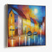The artist's vibrant palette infuses the scene with deep blues and rich yellows, creating a striking contrast that captivates the eye. Secondary colors like reds, oranges, and purples blend seamlessly, adding depth and warmth to the composition. Reflective puddles on the wet street mirror the brilliant hues, enhancing the overall sense of tranquility and calmness.
