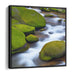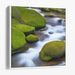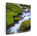 The focal point of this piece is the vivid green moss that carpets the rocks, infusing the landscape with a vibrant and almost mystical allure. Flowing water, depicted with silky smoothness through expert long exposure techniques, meanders gracefully around the moss-covered rocks, creating a sense of perpetual motion and calm.