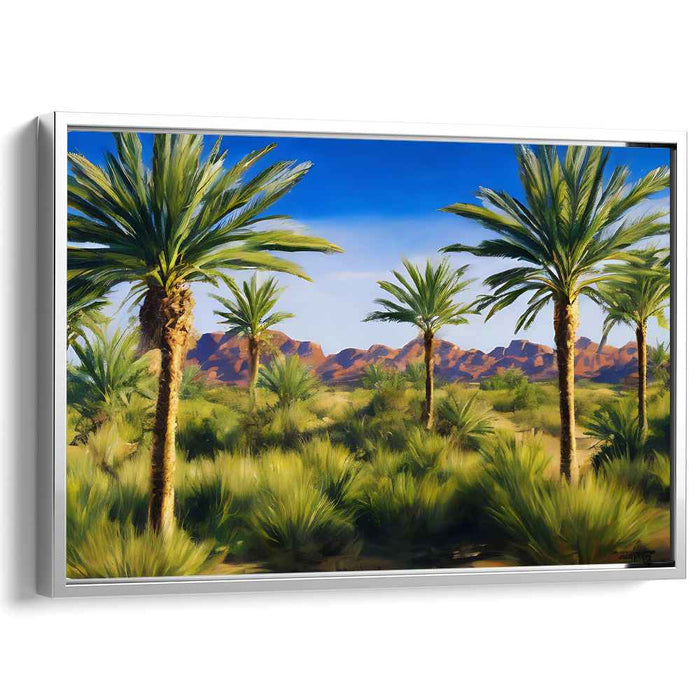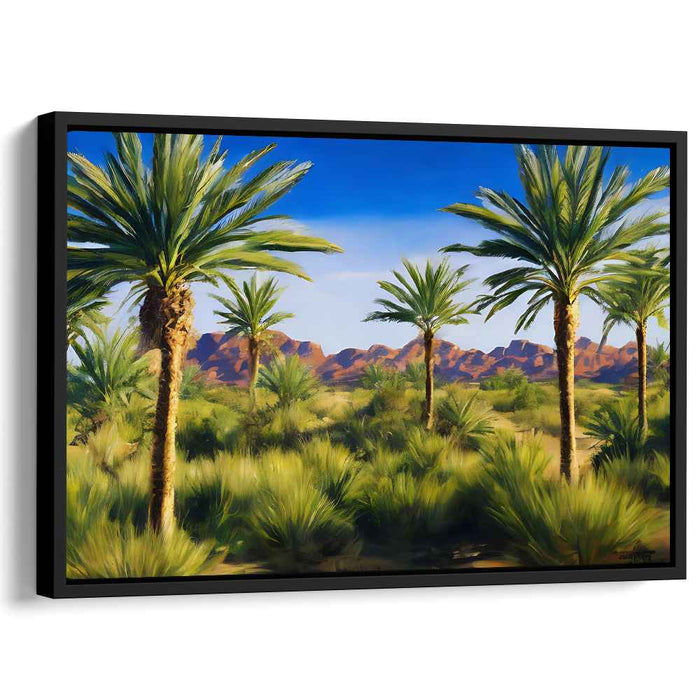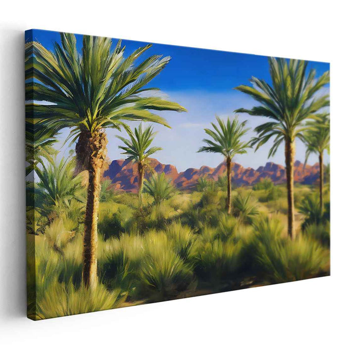 Introducing 'Mountain Whisper Amid Palm Symphony: Lush Palms Against Rugged Mountains,' a captivating canvas art print that transports viewers to a tranquil oasis nestled within a harsh desert landscape. This artwork beautifully captures the contrast between the towering palm trees reaching towards the vibrant blue sky and the rugged, sunlit red mountains in the backdrop.