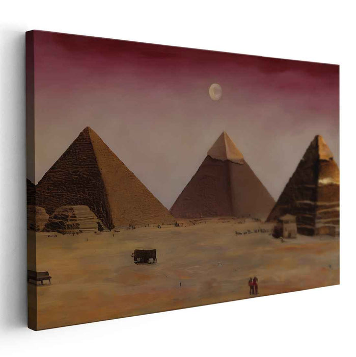 Step into the enchanting realm of "Mystic Twilight: Majestic Pyramids Under a Moonlit Sky," a mesmerizing canvas art piece that whisks you away to the mystical sands of Egypt. This captivating artwork captures the essence of ancient grandeur, featuring the iconic pyramids standing proudly under a twilight sky, exuding a sense of awe and wonder.