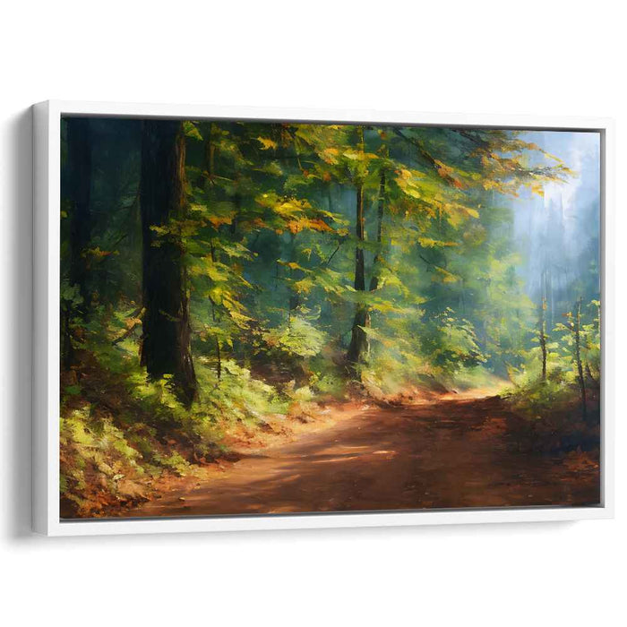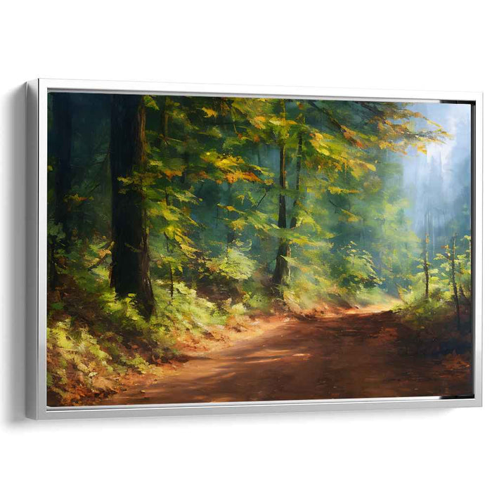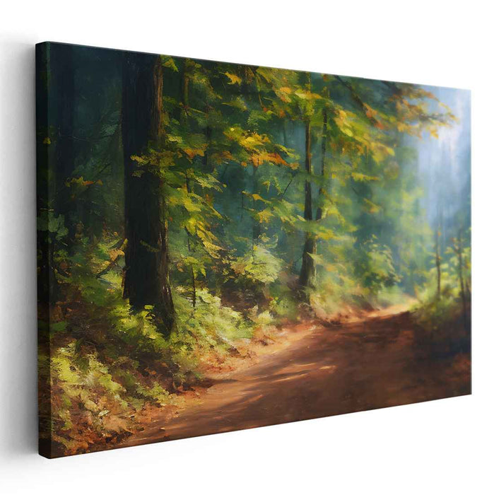 Introducing "Nature's Dawn Embrace: Morning Light in Nature's Embrace," a mesmerizing landscape canvas art that beckons viewers into a serene forest pathway illuminated by the soft morning light. This captivating artwork encapsulates the tranquility of a leisurely stroll through nature, where sunlight filters through the lush canopy, painting a tapestry of dappled shadows on the forest floor.