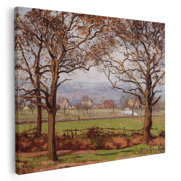 Embark on a picturesque journey with Camille Pissarro's iconic impressionistic masterpiece, "Near Sydenham Hill, Looking towards Lower Norwood." This captivating landscape, painted in 1871, invites you to immerse yourself in the beauty of the English countryside, rendered with Pissarro's signature brushstrokes and keen eye for capturing the fleeting effects of light.