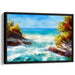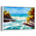 Immerse yourself in the serene beauty of 'Ocean Breeze Haven: A Tranquil Seaside Escape' canvas art print. This artwork captures a breathtaking seaside scene, where the azure sky meets the vibrant turquoise waters of the ocean. The foreground features dynamic, foamy waves crashing against rugged cliffs, beautifully framed by lush autumn-colored foliage in shades of gold, amber, and rust. The painting is a masterful display of watercolor techniques, showcasing fluid, overlapping washes that create a sense of depth and movement in the water, while detailed, textured brush strokes depict the rough, rocky textures of the cliffs and the soft, airy leaves of the trees. This artwork evokes a mood of peaceful solitude and the rejuvenating power of nature, making it an ideal addition to any space that craves a touch of calm and inspiration. The use of bright, primary colors of blue and green, complemented by the warm secondary tones of yellow and orange, adds to the artwork's vibrant yet soothing appeal.