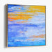The upper part of the canvas is bathed in the warm, radiant hues of bright orange, mirroring the enchanting glow of a sunset. Seamlessly transitioning downwards, the painting unfolds into a boundless expanse of azure and cobalt blue, evoking the serene depths of a tranquil ocean. The artist's skillful layering of paint introduces depth and intensity through textured variations, capturing the fluid and tumultuous essence of water and air in motion.