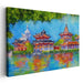Introducing 'Pagoda Vista,' a mesmerizing canvas art print that immerses viewers in a captivating traditional Chinese landscape, where vibrant pagodas grace a tranquil riverbank. The meticulous depiction of the pagodas' sweeping eaves and intricate designs, adorned in bold reds, oranges, and golds, contrasts strikingly against the lush green backdrop. The clear blue sky above enhances the scene's tranquility, while the river mirrors the vivid colors, creating a dazzling reflection that amplifies the artwork's vibrancy.