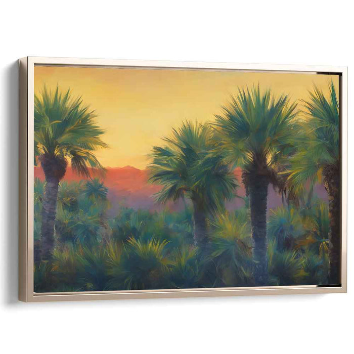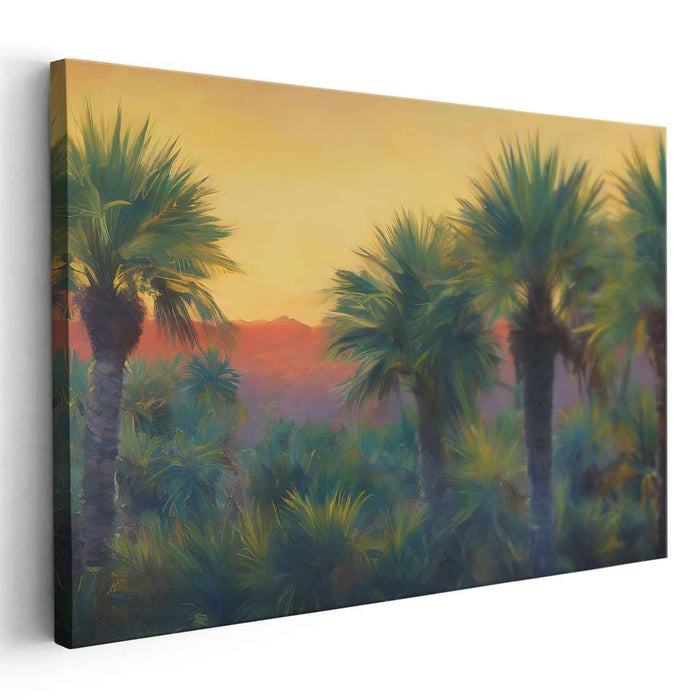 The mood of 'Palmy Nightfall' is calming and reflective, making it an ideal addition to spaces where you seek to bring nature's tranquility indoors. Drawing inspiration from Romanticism and Impressionism, this canvas art evokes a sense of peace and serenity, reminiscent of a serene tropical evening.