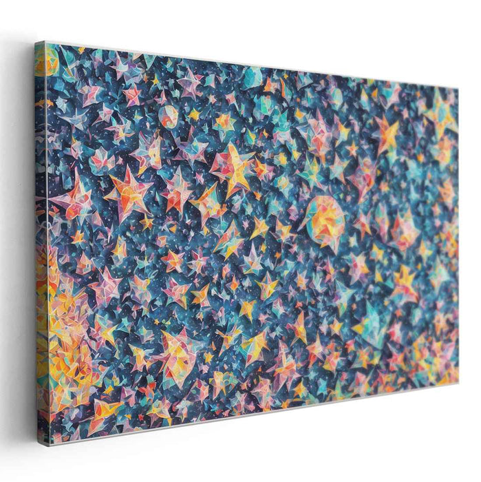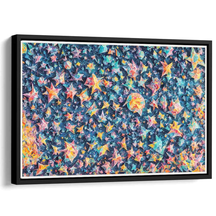 Introducing 'Paper Crane Constellation Burst,' a mesmerizing canvas art print that transports viewers into a whimsical night sky adorned with a myriad of colorful, origami-like stars. This captivating artwork weaves a vibrant tapestry of geometric shapes, meticulously crafted to evoke depth and movement within the cosmic expanse.