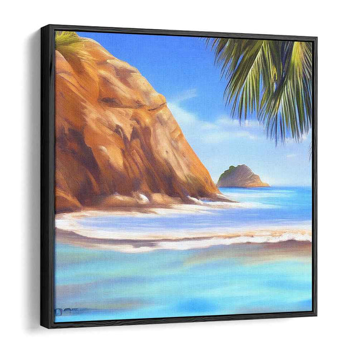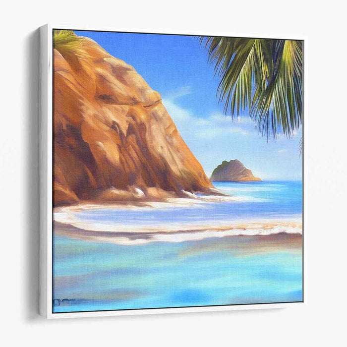 Immerse yourself in the tranquil allure of 'Paradise Shorelines: Tropical Beach Landscape Canvas Art,' a mesmerizing piece that whisks you away to a sun-drenched tropical beach where the cerulean waves gently caress the sandy shores beneath a cloudless azure sky. The artwork prominently showcases a rugged cliff, painted in rich earthy hues of amber and sienna, creating a stark yet captivating contrast against the cool, serene blues and turquoises of the ocean.