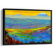 The primary color palette of this masterpiece features vibrant blues and greens, dominating the rolling hills and verdant fields, painting a picture of a rich and inviting landscape. Splashes of secondary colors like red, orange, and yellow punctuate the scene, particularly in the foreground where glimpses of wildflowers or autumnal foliage add depth and warmth to the composition, creating a harmonious and visually striking tableau.
