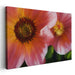 Introducing "Petal Mosaic Essence," a mesmerizing floral canvas art print that captures the vibrant beauty and intricate details of two vividly colored flowers in full bloom. This artwork presents a close-up view, where the primary flower commands attention with its captivating blend of pink, orange, and red petals, leading the viewer towards the delicate center of the flower. A smaller, yet equally striking, secondary flower on the right complements the primary bloom with its vibrant yellow and orange tones, adding depth and contrast to the composition.