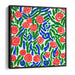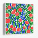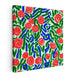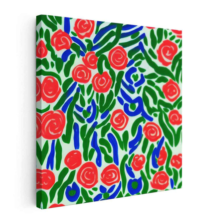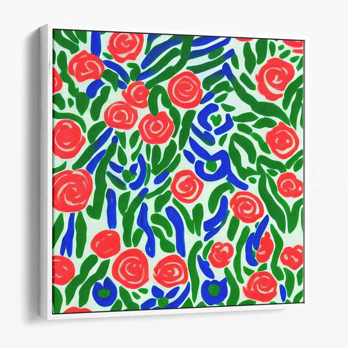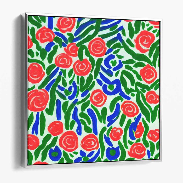 Introducing 'Petal Pulsation,' an exuberant abstract floral canvas art print that bursts with a riot of colors and dynamic forms, encapsulating the essence of a flourishing garden in full bloom. This lively artwork centers around a collection of abstract roses, depicted with bold and swirling strokes in a captivating shade of red, evoking a sense of passion and vitality.