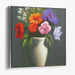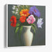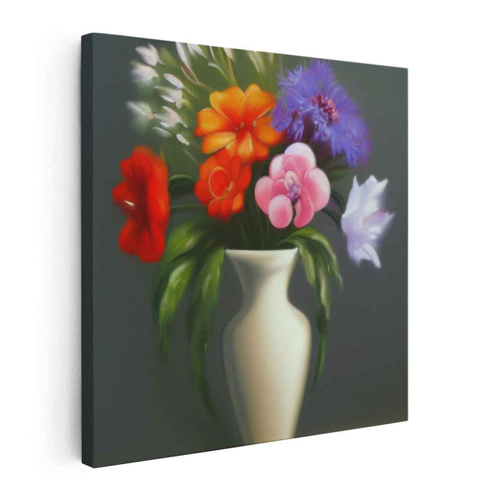 Introducing "Petals' Delicate Dance: Vibrant Floral Still Life in Classic White Vase," a breathtaking canvas art piece that captures the everlasting allure of a floral arrangement in a pristine white vase. This exquisite artwork showcases a vibrant bouquet brimming with life and color, featuring a captivating mix of orange lilies, red poppies, pink peonies, purple asters, and white tulips, meticulously detailed to highlight their unique textures and beauty.