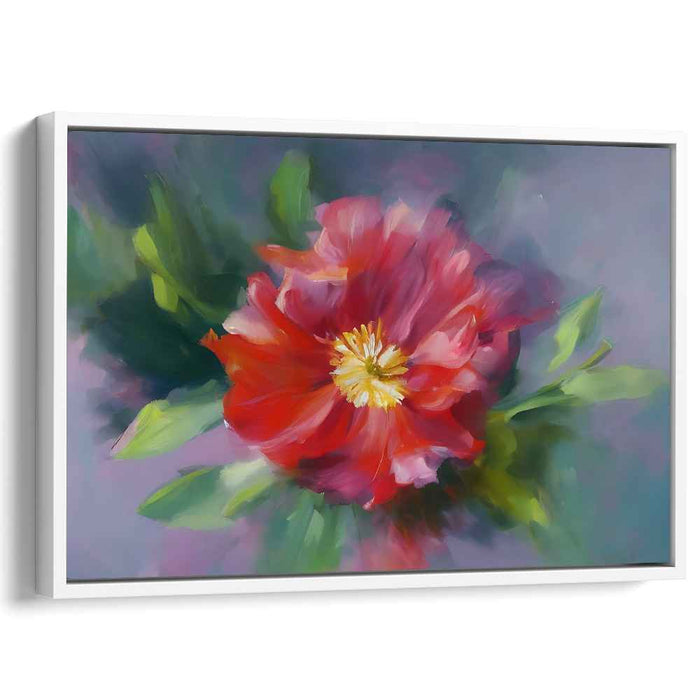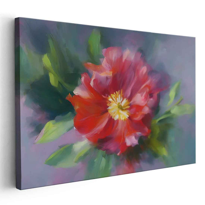 Step into the enchanting world of 'Petals in Aquarelle: A Lush Floral Impressionist Canvas Art,' a mesmerizing portrayal of a blooming flower that captivates with its vibrant colors and delicate beauty. This exquisite piece showcases a radiant red flower unfolding its petals gracefully amidst a sea of lush green foliage, set against a backdrop of ethereal lavender and soothing blue tones, creating a dreamy and enchanting ambiance.