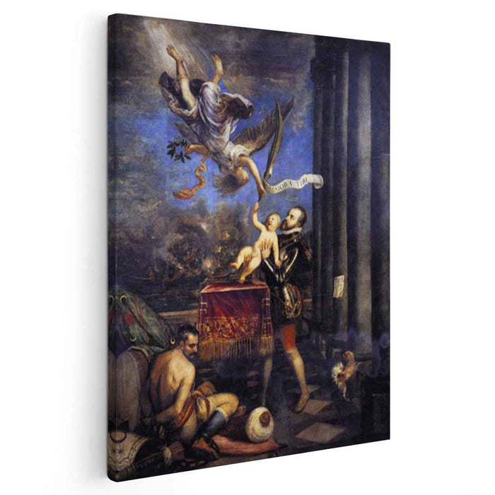 Titian's "Philip II Offering Don Fernando to Victory": A Majestic Allegory of Royal Power and Divine FavorUnveil the splendor of Titian's masterpiece, "Philip II Offering Don Fernando to Victory," painted in 1570. This allegorical artwork captures a pivotal moment in Spanish history, portraying King Philip II presenting his son, Don Fernando, to the personification of Victory. Now, you can adorn your space with a high-quality canvas reproduction, allowing you to fully appreciate its grandeur and symbolism.
