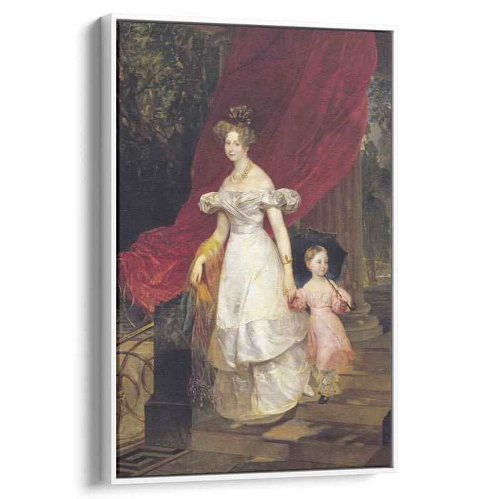Step into the enchanting world of Karl Bryullov's "Portrait of Grand Duchess Elena Pavlovna and Her Daughter Maria" (1830). This captivating canvas, now available as a stunning high-quality canvas print, invites you to witness the timeless beauty and intimate bond between mother and daughter.