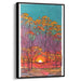 The vibrant and contrasting colors in the painting evoke a sense of warmth, tranquility, and wonder, inviting viewers to immerse themselves in the serene beauty of the sunset scene. This artwork is ideal for spaces like the living room or bedroom, where its calming mood and vibrant colors can be fully appreciated.