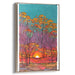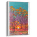 The focal point of the artwork is a dense forest of tall, slender trees with intricate black branches that reach towards the sky, creating a captivating silhouette against the vibrant backdrop. The trees' foliage is depicted in a stunning array of yellow and orange tones, reminiscent of the full bloom of autumn. The sky transitions from a deep turquoise at the zenith to a rich magenta near the horizon, where the sun emanates a brilliant orange and yellow light, painting the scene with a magical glow.
