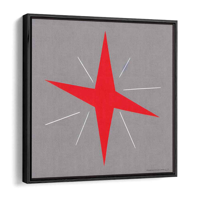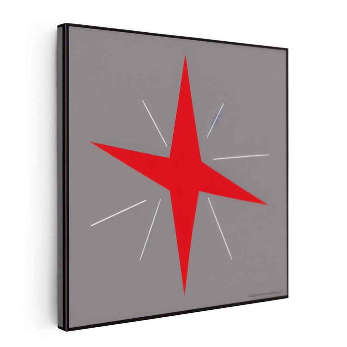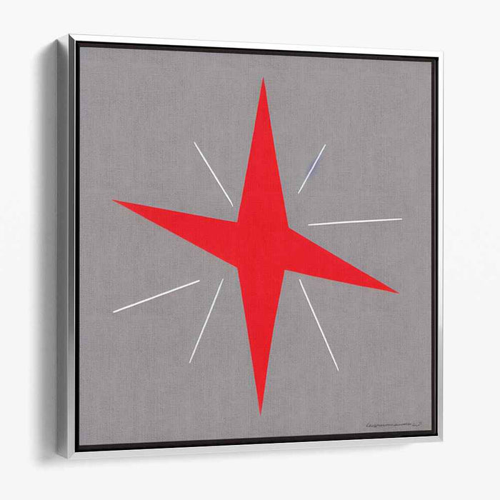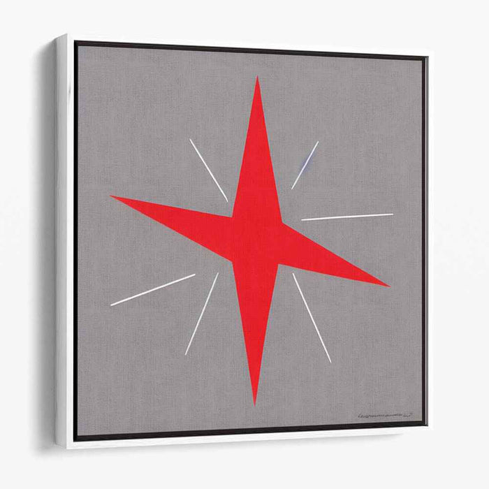 The artwork's central red star, surrounded by dynamic white lines radiating outward, creates a sense of movement and vitality within the composition. The simplicity of the design, characterized by its geometric precision and stark contrasts, is a hallmark of the minimalist art movement, echoing the visual power of artists like Ellsworth Kelly and Kazimir Malevich.