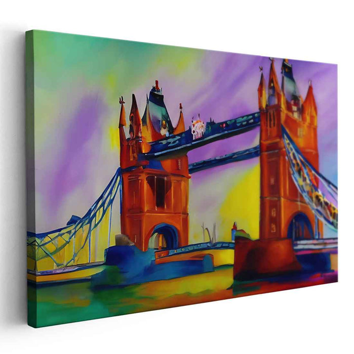 Introducing "Radiant Reimagining: Tower Bridge in Vibrant Hues," a captivating and contemporary landscape canvas art that offers a fresh perspective on the iconic Tower Bridge in London. This vivid artwork presents the bridge in a modern and colorful style, where the primary colors of purple and yellow skies dominate, creating a mesmerizing and dreamlike ambiance that immediately captivates the viewer.
