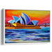 Introducing 'Radiant Sydney Opera House,' a contemporary sunset canvas art print that vividly captures the iconic Sydney Opera House in a burst of vibrant colors and dynamic energy. This artwork presents the Opera House's distinctive sail-like structures in mesmerizing shades of blue and white, standing out against a fiery sunset sky painted with warm oranges, reds, and yellows, creating a dramatic and captivating backdrop.