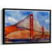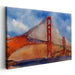 The focal point of this piece is the striking red-orange hue of the Golden Gate Bridge, standing boldly against a backdrop of serene skies and calm waters. The intricate depiction of the bridge's towering pillars and suspension cables highlights the artist's skill in capturing the essence of this iconic structure.