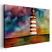 Introducing "Rainbow Beacon Escape," a vibrant watercolor lighthouse canvas art that mesmerizes viewers with its striking depiction of a majestic lighthouse set against a backdrop of swirling, vivid colors. This captivating artwork features a bold red and white striped lighthouse that commands attention, its glowing light drawing the eye upwards towards the sky.