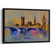 This masterpiece is bathed in warm yellows and oranges, reminiscent of the golden hour just before sunset, enveloping the buildings and the sky in a soft, ethereal glow. Complementing these hues are cool blues and purples reflecting in the river Thames, creating a captivating contrast that enhances the overall visual impact.