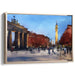 The focal point of this piece is a majestic architectural structure reminiscent of the iconic Brandenburg Gate, standing tall amidst a city alive with the hustle and bustle of daily life. The scene is painted in a palette dominated by a deep, luxurious blue sky, casting a serene yet energetic ambiance over the urban landscape. Warm ochre and subtle red tones adorn the buildings, adding layers of depth and contrast to the composition.