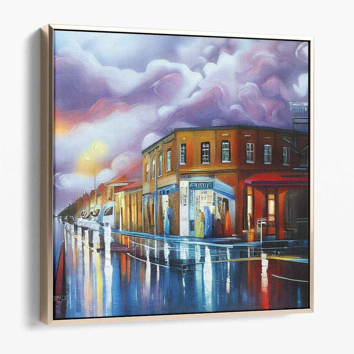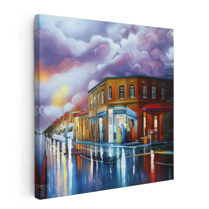 Introducing 'Rainy Evening Serenity: Urban Street Reflections,' a mesmerizing canvas art print that transports you to a serene, rainy evening in an urban landscape, capturing the tranquil beauty of a city street adorned with the soft glow of streetlights reflecting on the glistening pavement. This artwork's focal point is a captivating row of brick buildings, their warm, earthy hues standing out against the cool blues and purples of the sky and street.