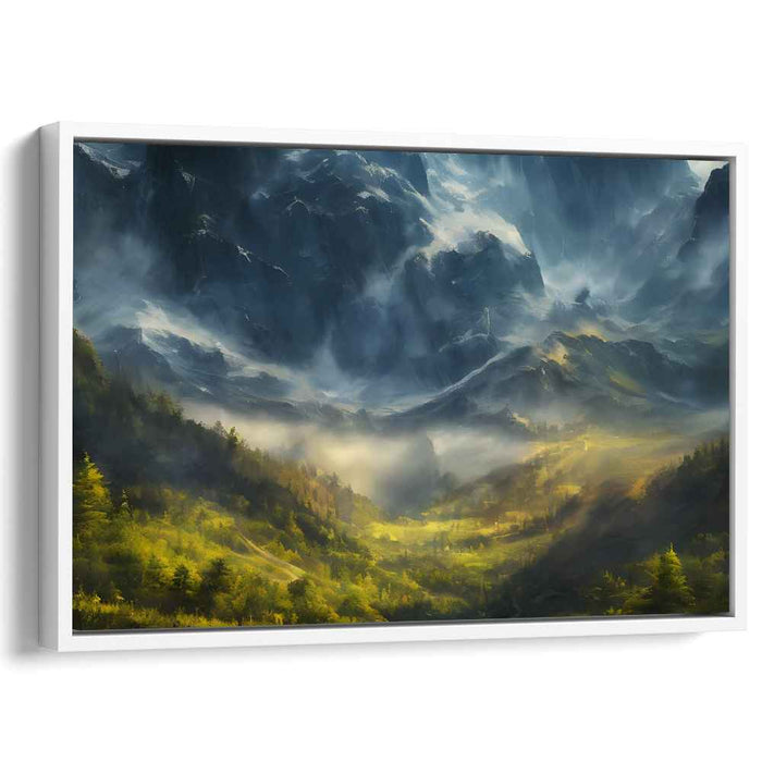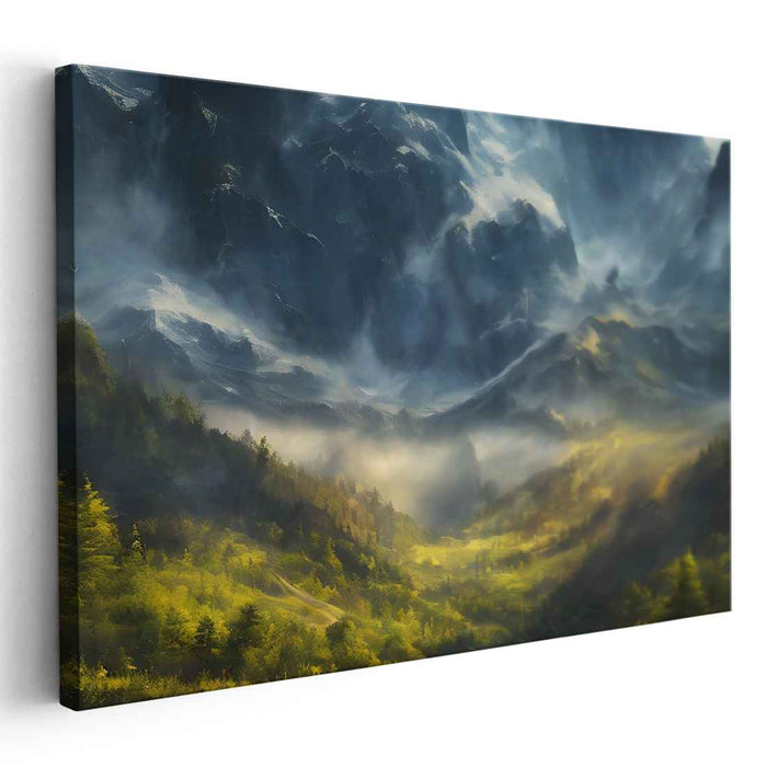 Decorate your walls with this high quality Realism Misty Mountain art print on canvas. Whether you hang it in your living room, bedroom or office, this artwork is sure to add a touch of beauty and color to your room.