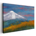 The sky, a mesmerizing blend of blues and pinks, sets the scene for either a serene dawn or a tranquil dusk, infusing the artwork with a layer of romanticism and peace. Below the majestic mountain, a lush green forest transitions into a field painted with golden-yellow and orange hues, reminiscent of the warm tones of autumn, evoking a sense of coziness and nostalgia.