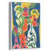 Introducing "Sapphire Blossoms Dance Freely," a mesmerizing still life canvas art that bursts with the vibrant energy of a colorful floral arrangement set against a deep blue backdrop. This captivating piece features a white vase brimming with an assortment of lively flowers, each petal and leaf depicted in a bold and simplified style that prioritizes form and color over intricate details.