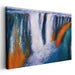 The artwork's primary palette features vivid blues and whites, skillfully depicting the flowing water and mist with a sense of movement and vitality. Complementary hues of rich oranges and greens infuse depth and contrast, enhancing the visual impact of the cascading waterfall.