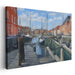 Step into the tranquil world of 'Seaside Sanctuary: A Tranquil Day at the Dock,' a mesmerizing canvas art print that captures the essence of a peaceful maritime setting with exquisite detail and serene beauty. This artwork transports you to a serene harbor where traditional boats gently sway in the calm waters, tethered to a weathered wooden dock. The foreground meticulously portrays wooden planks and mooring posts, guiding your gaze towards the vibrant, colorful buildings that adorn the distant shore.