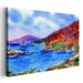 Immerse yourself in the serene beauty of 'Seaside Serenade Splash Dance: Coastal Vista Watercolor,' a mesmerizing canvas art print that transports you to a breathtaking coastal landscape, expertly depicted through the ethereal medium of watercolor. This exquisite artwork presents a sweeping vista of a rocky coastline, where the azure waters of the sea meet the rugged, earthy tones of the shore. Central to the composition are the vibrant red hues of autumn foliage, contrasting vividly against the backdrop of distant mountains and a clear sky.